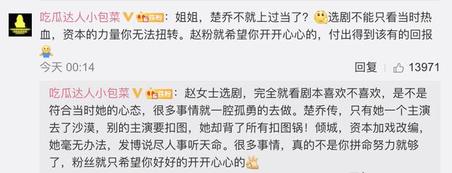 虽然赵丽颖只字未说,但是想必大家都能看出来她想表达什么。我们都知道,颖宝向来专注于拍戏,不轻易表达个人想法、私人情绪,是个安分守己、兢兢业业的演员。对于许多艺人来说,能当主演已经很不错了,听从组织安排就好,但是这次改编事件,颖宝大概是真的无法忍受,所以才会情绪大爆发。