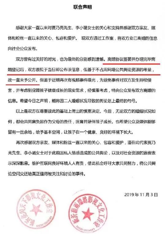 这份联合声明,表示贾乃亮和李小璐在完成离婚协议签署并办理完毕离婚登记后,原拟当天公布消息,但基于不占用网络公共舆论资源的考量,一直没有公开。