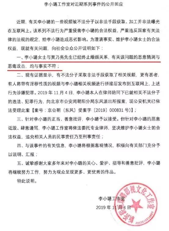 表示李小璐与贾乃亮已经离婚,关于该问题的恶意猜测和恶毒攻击,均与事实不符;之前的相关视频是不法分子采取非法手段获取,还有人将带有淫秽性质的视频与李小璐相关视频进行拼接后发布到网上,涉嫌犯罪,李小璐已在律师陪同下报案。