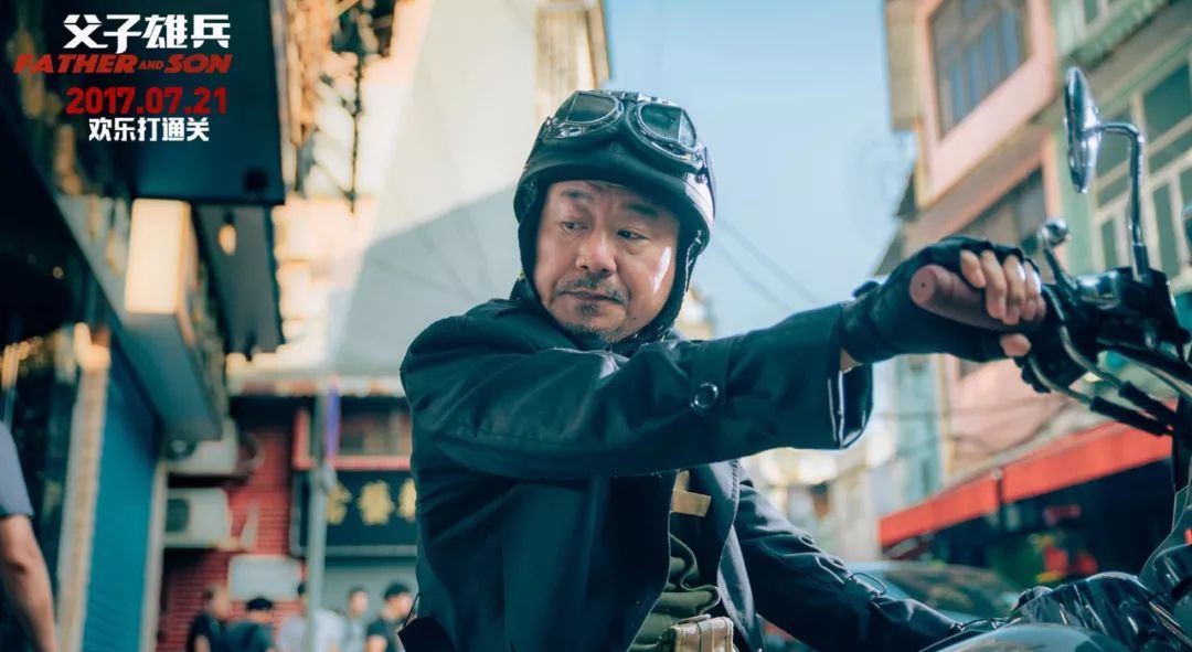 《父子雄兵》里,他甚至一改自己擅长的小人物形象,以头盔加墨镜,风衣配机车的的酷炫造型颠覆了观众。