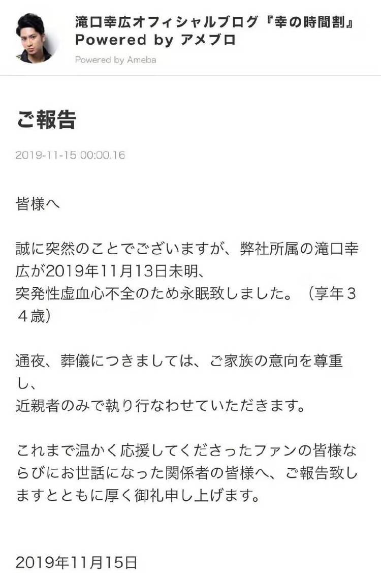 据说,泷口幸广在2019年11月11日的时候,还在自己的个人社交账号上面更新了自己的动态,而且还出席了娱乐圈的一些活动,和平时一模一样。所以,泷口幸广去世的消息来的非常突然。