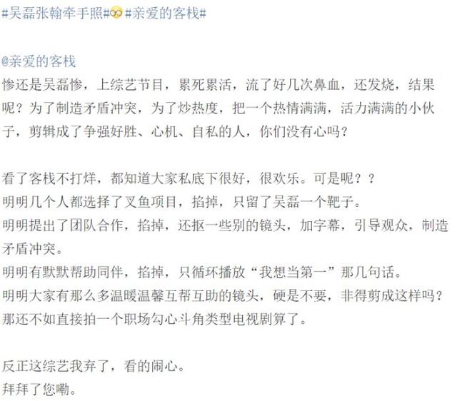 毕竟客栈已变成了职场生存录,职场上的竞争是难免的,只是职场上若处处都是竞争比较,没有人情味也是要人大呼崩溃的,吴磊无疑触雷了。