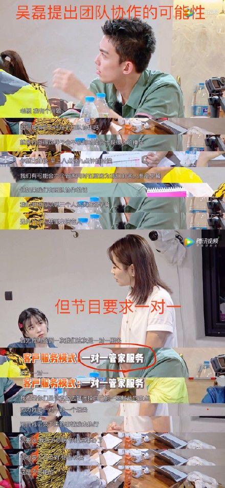 说吴磊自私似乎也不尽然,在竞争开始之前,吴磊其实提出过一对一管家的不合理性,提出过团队合作的方案,只是被刘涛否决了,而这一段正片中没有。