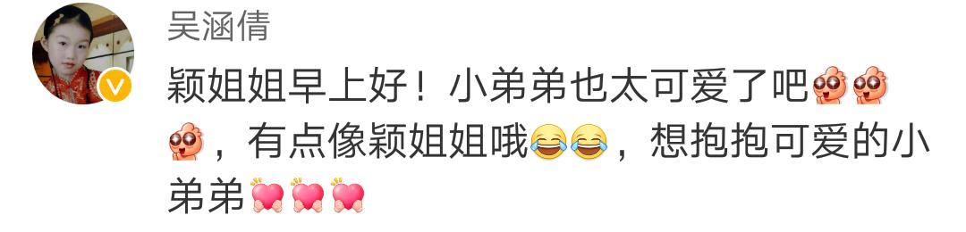 看到冉莹颖分享的三胎近照后,网友们纷纷留下了各自的看法:“又来了一个轩轩,都好像!”、“三个娃都好像啊!像爸爸”、“生了一组套娃,最幸福的家庭棒棒哒!”、“颖姐姐早上好!小弟弟也太可爱了吧,有点像颖姐姐哦,想抱抱可爱的小弟弟”、“肉乎乎的!太可爱了胖小子!像你多些!”、“我觉得弟弟长大后看到这组照片会不理妈妈”、“真是一家人,又像哥哥又像弟弟的,噢,是二哥”、“我觉得后几张好像你哈哈大笑起来唉,神态像”。
