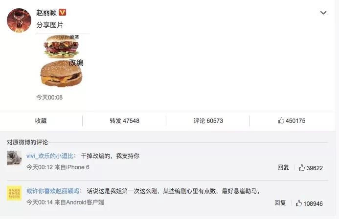 这条微博中,赵丽颖晒出一张汉堡对比图。图片中,代表原著的汉堡非常“有料”,而代表改编的汉堡则明显“偷工减料”,少了精华内容。或许她想要以此来借喻改编和原著的差异,却一“图”激起千层浪。