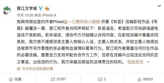 今天下午,《有翡》作者Priest和晋江文学城发共同声明回应剧情被改编一事,称若是谣言希望剧方尽快澄清,若非谣言希望剧方在改编中尊重合同,“我方绝不接受改变主要人物核心人设、主要人物关系,并给主要人物添加违背原作写作意图的非必要狗血感情纠葛等行为”。