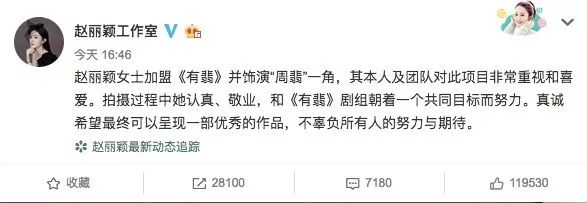 随后,赵丽颖工作室发声,《有翡》官博进行了转发: