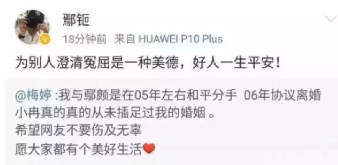 当时的丑闻沸沸扬扬,梅婷是个分得清大是大非的女人,面对外界的舆论,她发布了一条有爱的微博,替前夫和李小冉证明清白:跟鄢颇是在05年和平分手,并在06年就离婚的,这中间李小冉并没有插足,所以她希望大家不要冤枉无辜的人。
