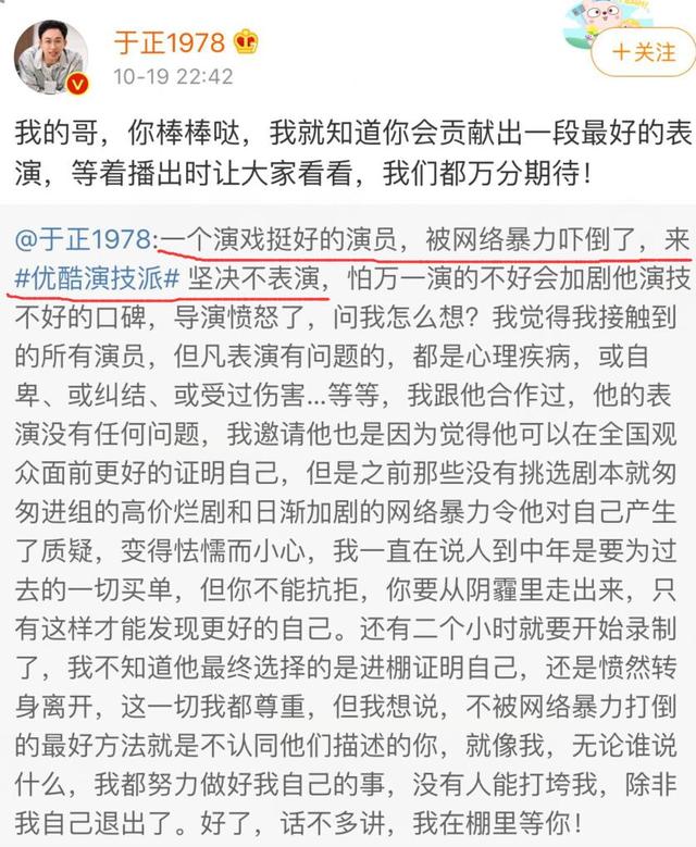 原标题:于正说的演员是他?因网络暴力不敢演戏,参加《演技派》秒被