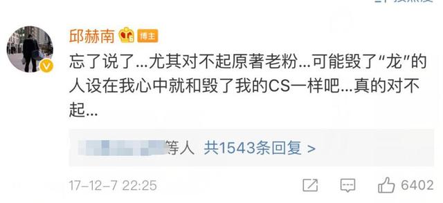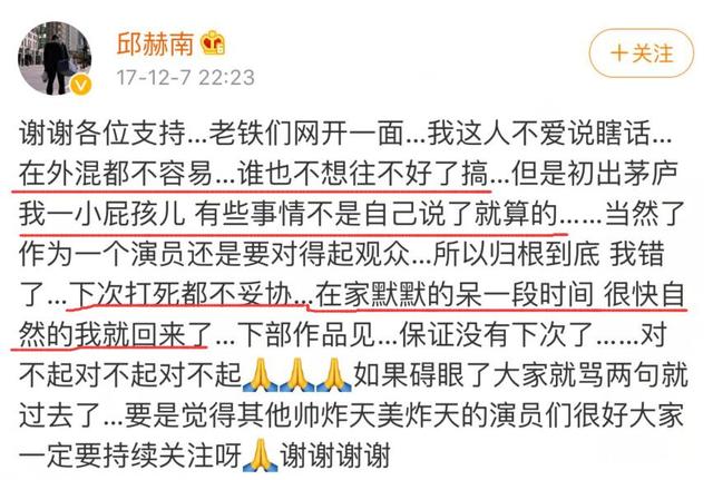 邱赫南也没有遮遮掩掩,在微博承认了此事,称自己初出茅庐,什么也不懂,有些事情不是自己说了就算,并保证自己下次打死也不会妥协,自己会在家呆一段时间,很快就会变得自然回来了,并因为毁了大家心中的龙日一而向观众道歉。