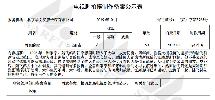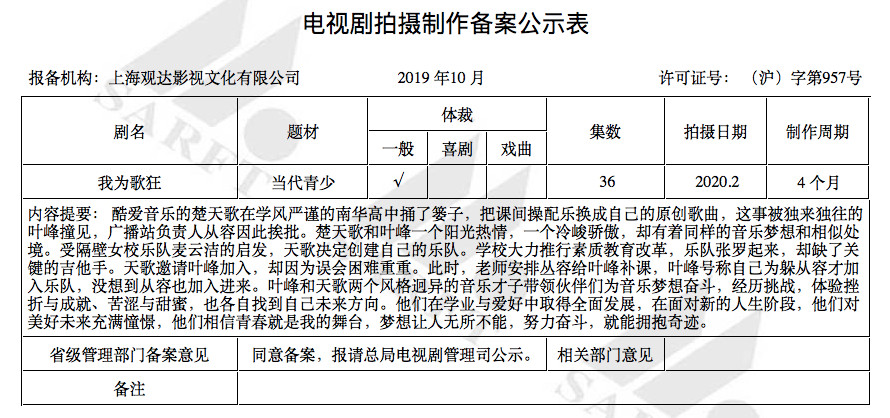 原标题:剧版《少年的你》、真人版《我为歌狂》10月电视剧备案来