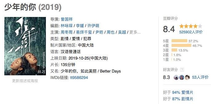 电影《少年的你》可以说是今年备受关注的一部影片,豆瓣52万人评价8.4分的成绩可谓不俗。从故事到表演,这部电影都实为惊艳,有许多业内人士不吝赞美,电影所聚焦的校园霸凌问题也引发了社会关注。