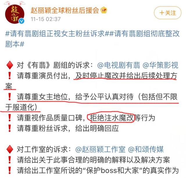 《有翡》从开机以来就风波不断,不仅是因为两位主演赵丽颖、王一博的超高人气,更是因为节目组的各种骚操作,引得赵丽颖粉丝多次艾特官微维权,今天凌晨,赵丽颖也亲自发了条意有所指的微博,疑似对《有翡》的剧本改编不满,吐槽剧组把原著饱满精华的部分改编得干瘪无趣,随后赵丽颖工作室也转发她的微博,与剧组正面刚。