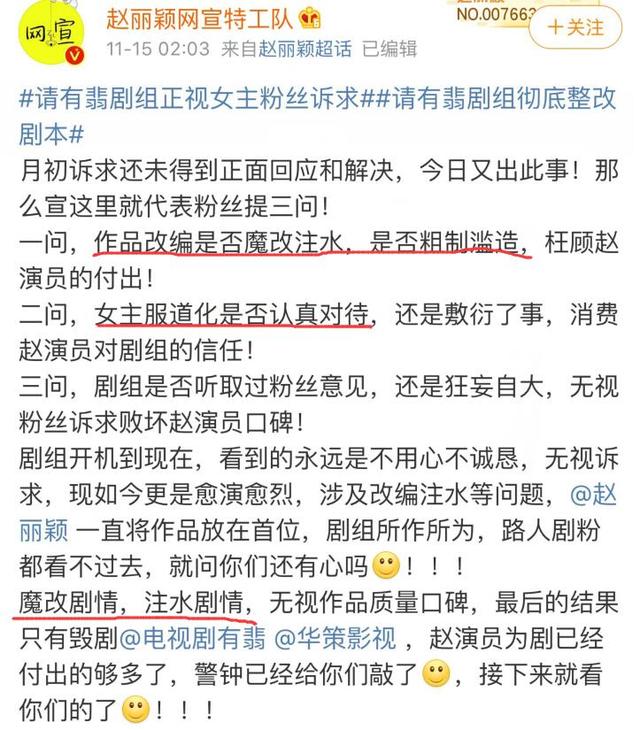 微博发出后,赵丽颖在线很长时间,但没有对外作出解释,直到她的官方后援会发博大家才确定,确实是因为剧情注水、演员加戏、魔改剧本、没有得到女主应有的待遇而开撕剧组。