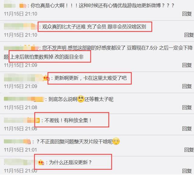 但开播第3天,就突然宣布因为介质原因调整更新日期,并且当晚只更新了一集,气得观众纷纷质问平台,为什么不更新,充了会员跟非会员没有区别。