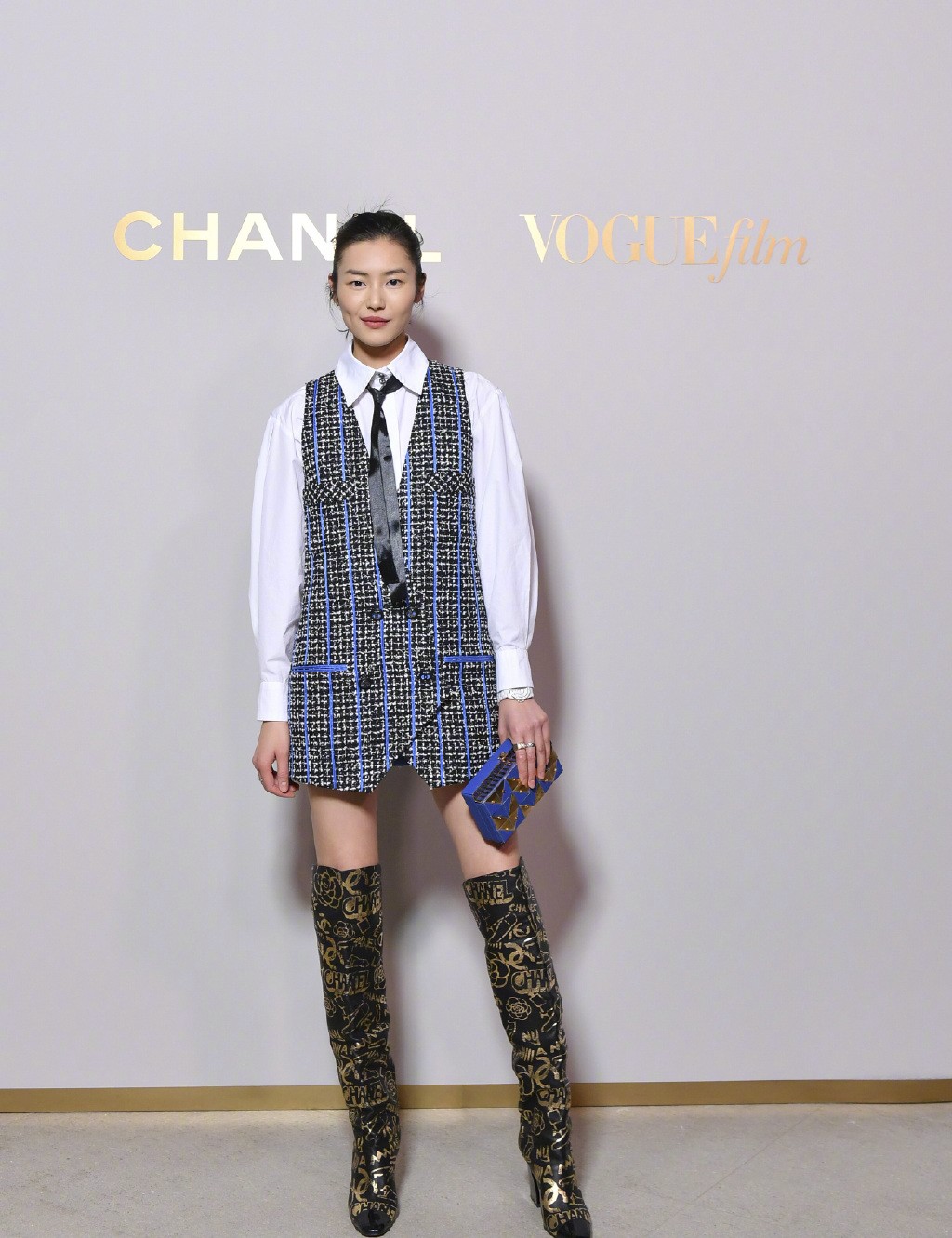 ▲刘雯作为模特腿长是必须的,她用一双长靴来突出她的优点,身上的西装马甲裙设计成了一种平面化的感觉,内搭白色衬衫,一个比较独特的搭配。
