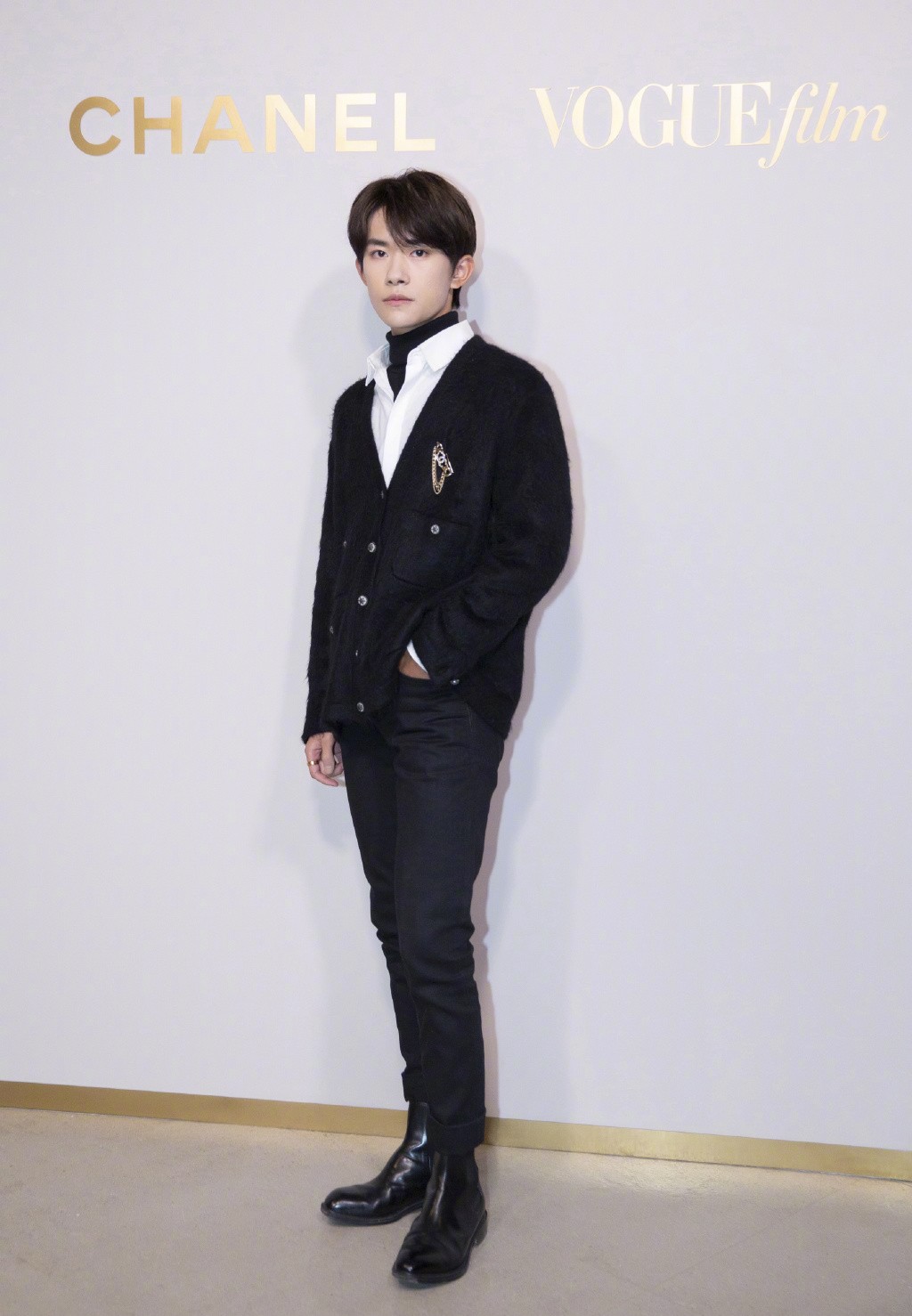 ▲当天易烊千玺身穿黑色的针织外套,内搭一件白衬衣,衬衣下是高领的打底衫,这样一层一层的穿着穿出丰富的层次感。外套规规矩矩的系上扣子,并用金属的胸针进行装饰点缀,整个造型看起来相当斯文,俨然一位贵气的公子。