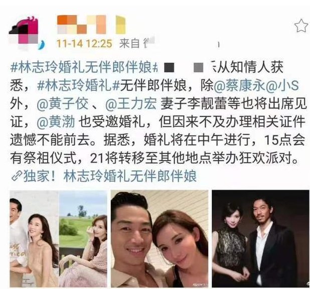 11月17日,林志玲将和她的日本丈夫在台南市第一美术馆举行婚礼,和其他明星艺人相比,林志玲的婚礼是相当低调,只邀请圈内为数不多的好友,而在林志玲结婚后,也将和她的丈夫一同定居日本。