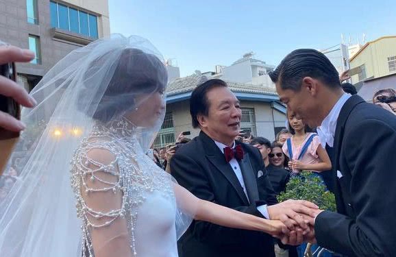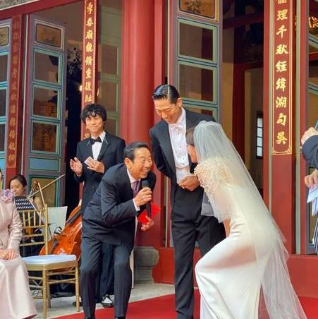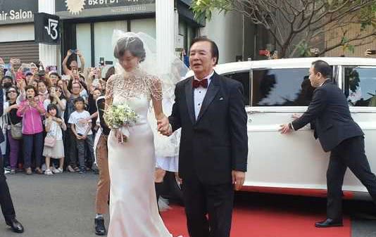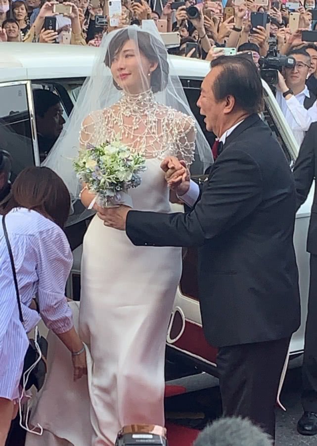当天下午两点,林志玲身穿特别设计的婚纱,挽着父亲的手,一同前往祠堂举行婚礼。