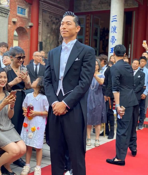 AKIRA一早到祠堂等候妻子,身高180+厘米的他,显得十分挺拔,微笑着等待妻子出现。