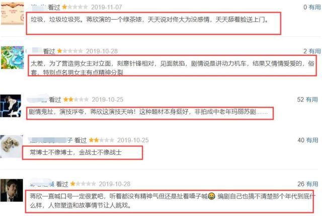 不少人直接打了一星差评,他们不满的原因主要有三点。第一,剧情不真实,他们认为这里面的剧情太接近现代风格了。二、蒋欣、佟大为把一部年代剧演成了玛丽苏剧。三,蒋欣把金灿烂演出了华妃的特色。众所周知,蒋欣是大器晚成,凭借《甄嬛传》华妃一角成功走红。然而此后,蒋欣却被华妃这个标签困扰着,演什么都像华妃。