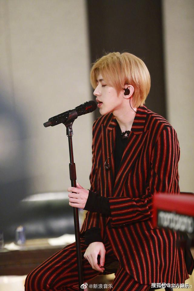 在强有力的节奏下,蔡徐坤随着鼓点自由的律动身体,把金色亮眼的头发甩在空中。