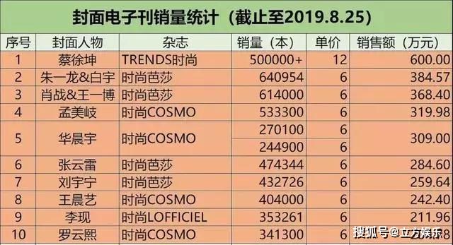 电子刊方面,蔡徐坤更是优势巨大,以五十万加的销售数量,六百万的销售额远超一众明星,成功领跑榜单。