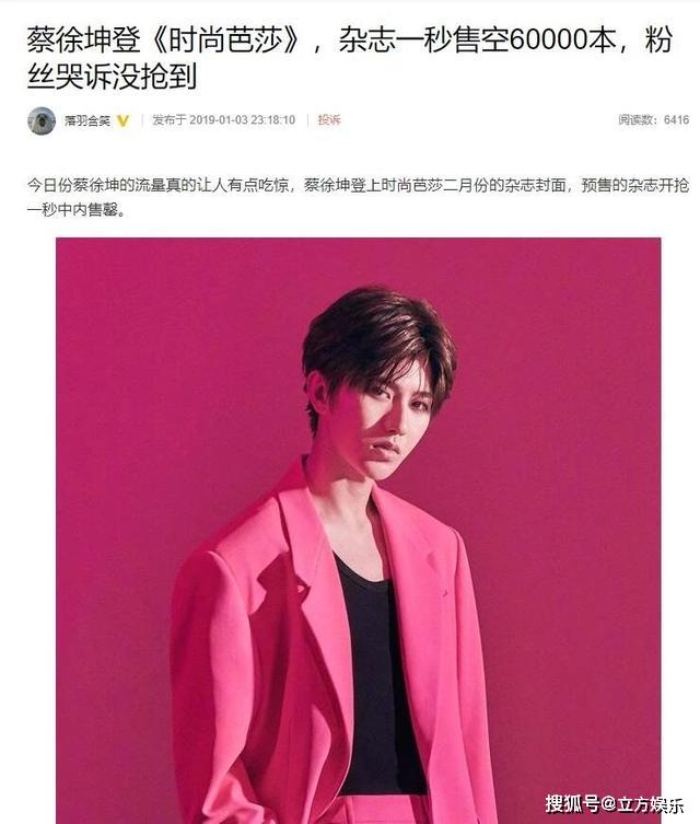近期,蔡徐坤登上封面的两本正刊杂志,几乎都是一上线就六万本库存全部秒空,都是蔡徐坤这"不可抵挡"的魅力,根本不给人丝毫犹豫的机会。