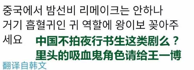 还有人建议中国也拍个《夜行书生》类似的剧,让王一博出演吸血鬼。韩剧《夜行书生》中,出演吸血鬼的李洙赫可是因为绝美容颜,让不少少女粉丝纷纷上头呢。