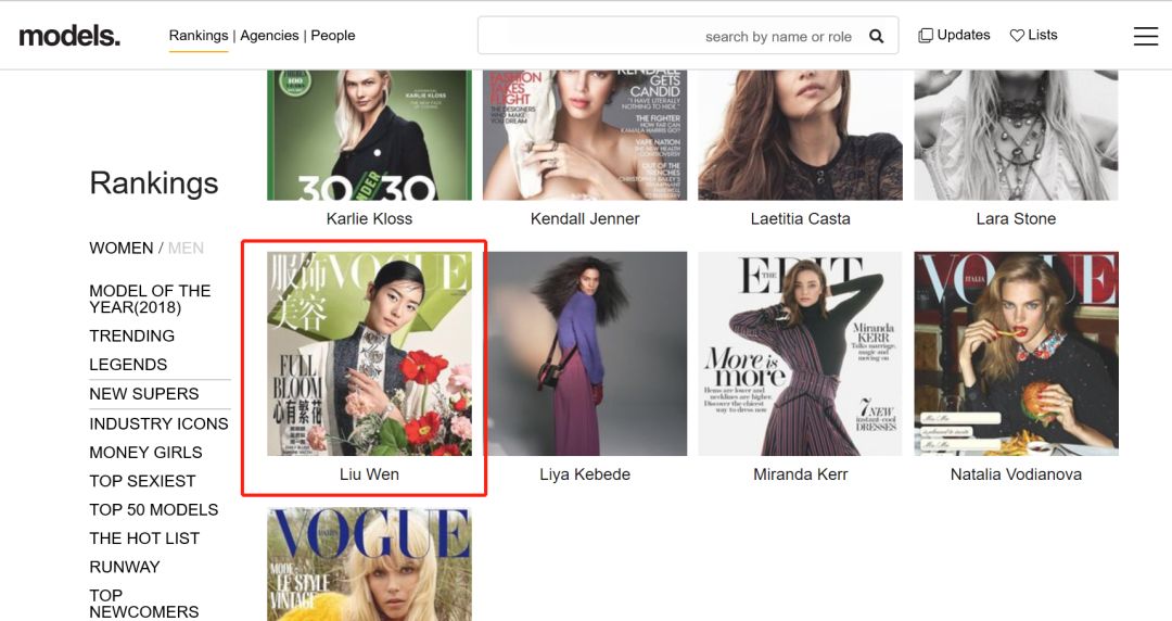 2013年,刘雯在网站MDC排名第3位,居中国模特首位。同年,获“ELLE国际偶像超模”奖。