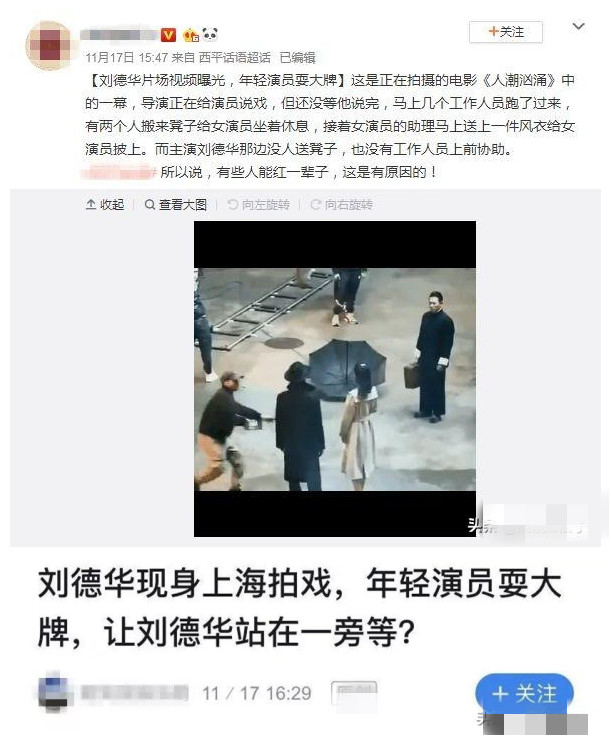 之后,女演员还被特殊对待,工作人员直接搬来凳子,给女演员坐,还有大衣给她保暖,大家来看看华仔在干嘛?