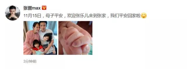 11月19日中午,张晋在微博发文:“11月15日,母子平安,欢迎张乐儿来到张家,我们平安回家啦。”