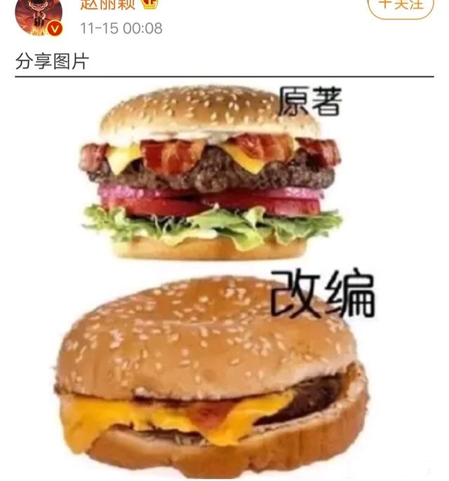 前几日,赵丽颖突然在网上发布了一张照片,图片上有两个被标注了原著和改编的两个汉堡。有原著标志的汉堡是又大又圆,看上去肉多菜满,非常的诱人。有改编标志的汉堡则是干干巴巴,麻麻赖赖,一点都不圆润。赵丽颖虽然没有明确的说明,但是显而易见,是想说原著已经被改编得不成样子了。