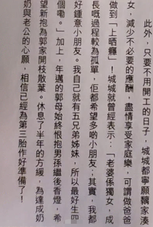 此前郭富城就面对媒体公开表示,因为老婆是独生子女,成长过程中难免孤单,而他自己家中有5个兄弟姊妹很是热闹,因此也希望妻子能连生4-5胎。对此小扒不禁想问一句,郭天王是不是把怀胎十月想象得太简单了?