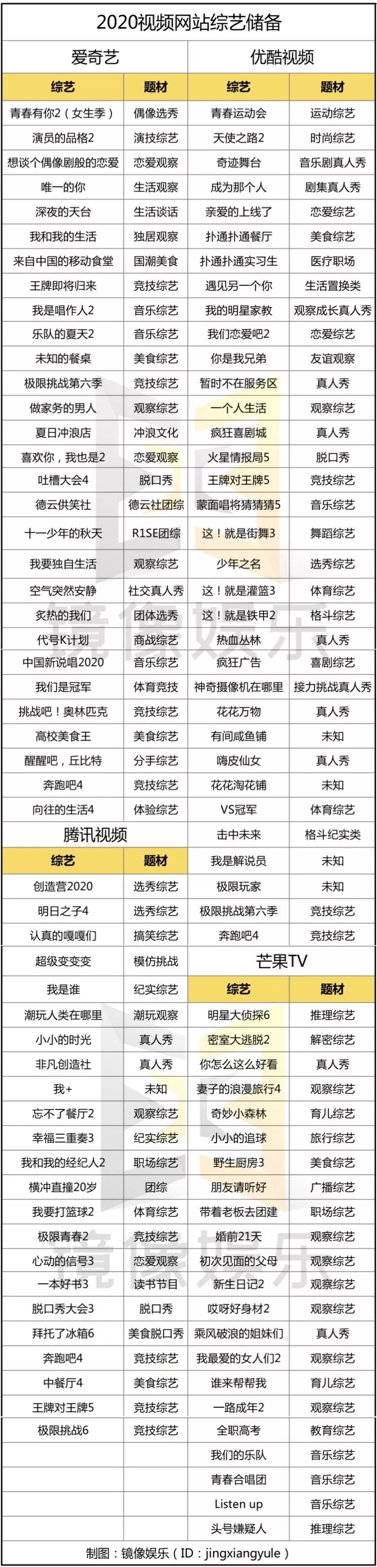 近期,优爱腾芒四家视频网站陆续公布了2020年的内容储备,镜像娱乐日前分析了四家的剧集储备《优爱腾芒2020年130+部新剧前瞻:减量提质、新势入局,网剧变局将至》后,再度对四家的综艺项目进行了盘点。