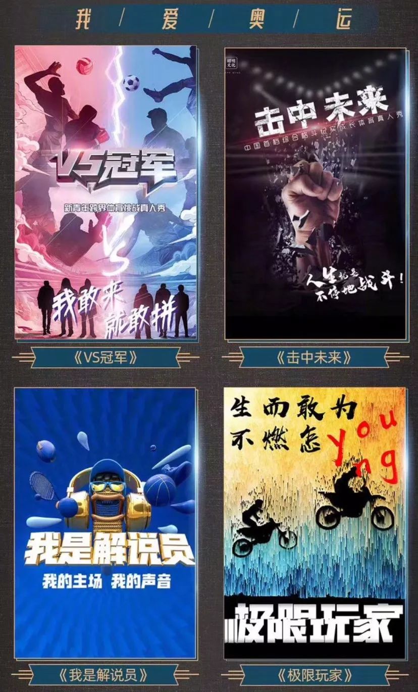 优酷在综艺片单中直接划分出了“我爱奥运”这一版块,其中包含了《VS冠军》《击中未来》《我是解说员》《极限玩家》四挡节目。《VS冠军》为新青年跨界体育挑战真人秀,《击中未来》为中国首档综合格斗纪实成长体育真人秀。不过,目前优酷这四档体育、竞技综艺的具体玩法都未公布。
