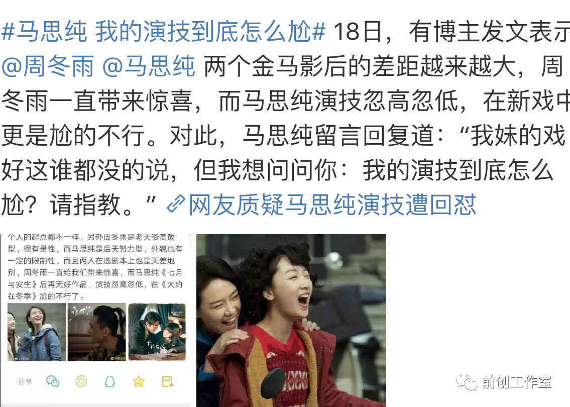 最近马思纯在参加一档综艺节目,与来自不同阶段的优秀演员搭戏,马思纯因此也略微有点不适应。在深夜马思纯看到网友将自己的演技与周冬雨对比时,竟然直接回复反问自己的演技到底哪里尬了。作为明星,如此直接下场开撕网友也是让人感到难以接受的。