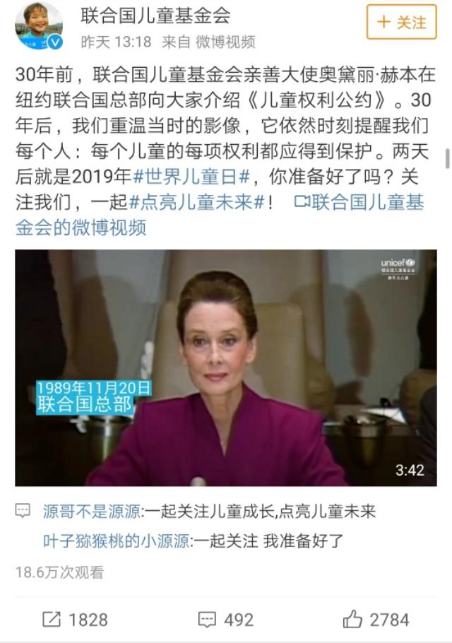 联合国儿童基金会还发博称:30年前代表发言的是联合国儿童基金会亲善大使奥黛丽•赫本。30年后,重温当时影像,它依然时刻提醒着我们:每个儿童的每项权利都应得到保护。