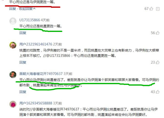 而马伊琍的粉丝也是在网上替自己家的偶像拼命拉票,还发评论称,马伊琍的演技更胜一筹。但是有不少路人也是力挺姚晨,称姚晨的戏路宽,马伊俐差的不是一星半点,而且姚晨在大荧幕上也有影响力,马伊俐在大银幕上根本不够打