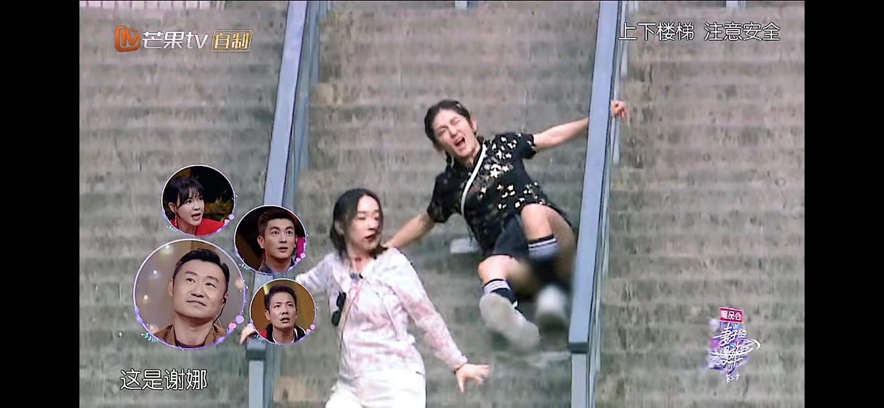 在张家界旅游下九百九十九级台阶的时候,谢娜走到最后,可能鞋子有点滑,腿有点软,结果跌下连滑了几个台阶,简直吓到大家,特别工作人员赶紧喊拿担架,说“娜姐跌倒了”,一直以为可能是李娜跌倒,其实想想李娜毕竟是运动员,应该没那么脆弱吧,想不到会是谢娜,因为任何人都没想到是谢娜,因为看到李娜走路的时候不是很利索。