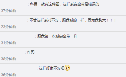 也有一些网友吐槽这样系安全带是错误的,科目考试时就考到了这个题目,也就是安全带不能系在腋下,更有网友吐槽这是“作死”。