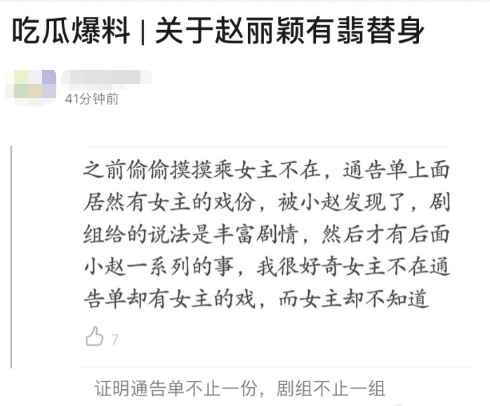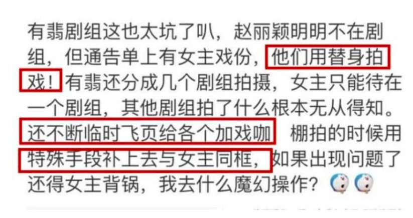 有网友爆料称,《有翡》剧组为了方便配角加戏,在片场甚至直接“架空”女主赵丽颖。剧组向赵丽颖隐瞒了很多配角新增的戏份,在另一个片场悄悄拍摄,遇到有女主出场的部分,就直接用替身抠图。