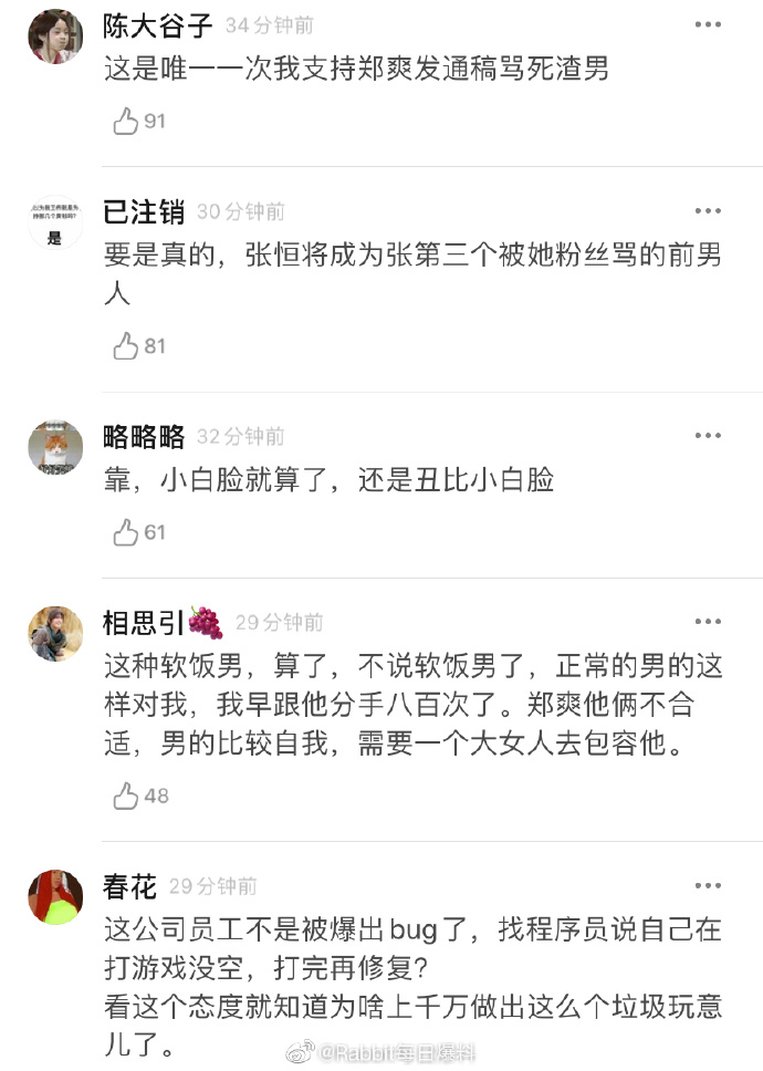“郑爽张恒疑似分手”再次上热搜,郑爽的每一段恋情都不被众人看好。从张翰,胡彦斌再到张恒,每一任男友都逃不过被黑的命运。《女儿们的恋爱》播出后,和男友张恒的恋爱便话题不断。两个人,一个是心中委屈百般不说,希望对方可以读懂自己的小心思,另一个是粗枝大叶,啥也察觉不到,说话方式毫无情商可言。就连papi酱都吐槽说张恒的情商实在太低,不知道如何处理两人之间的问题。