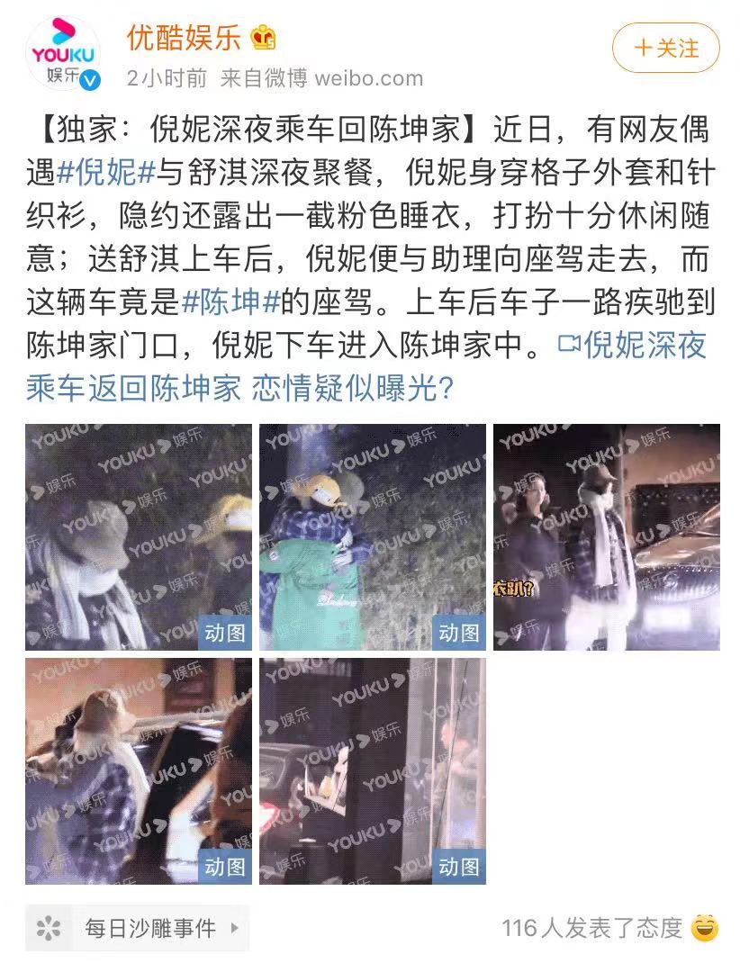 媒体报道深夜偶遇倪妮和舒淇深夜聚餐,倪妮身穿格子外套和针织衫,隐约露出一截粉色睡衣,打扮十分休闲随意,送舒淇上车,倪妮便与助理向座驾走去,而这辆车竟然是陈坤的座驾。上车后一路疾驰到陈坤家门口,倪妮下车进入陈坤家。