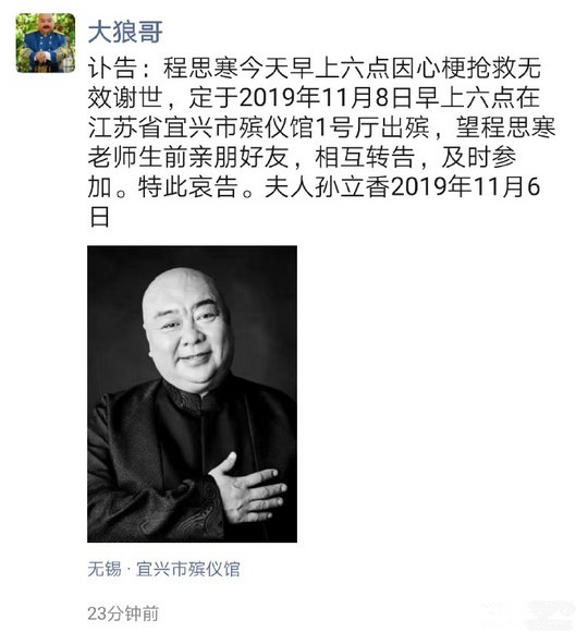 程思寒骤然离世让人惋惜,但实际上,近几年来他也因身体缘故低调许多,在其微博上,最后一条动态定格在2018年2月15日,当时正值新年伊始,程思寒也在微博上给网友送上祝福:“忙完刚到家,感谢这一年遇到的人和事,感慨很多,看着儿女成长,家庭和睦,朋友们蒸蒸日上,最后祝所有的朋友们新年快乐,狗年大吉啊!!!”