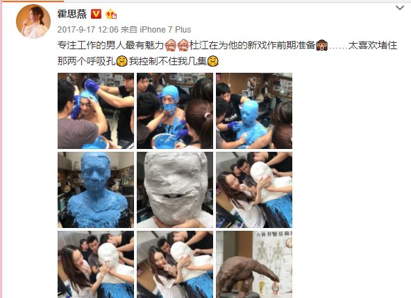 有一次杜江为新戏做准备,需要进行倒模,没想到霍思燕趁着杜江不能动的时候恶搞他,连发多张杜江倒模时候的照片,还用手堵住杜江鼻孔。