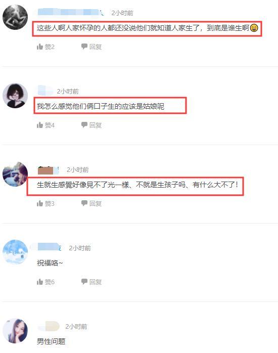 更多的人觉得非常意外:这些人啊,人家怀孕的人都还没说他们就知道人家生了,到底是谁生啊。我怎么感觉他们两口子生的应该是姑娘呢。生就生感觉好像见不了光一样、不就是生孩子吗、有什么大不了!