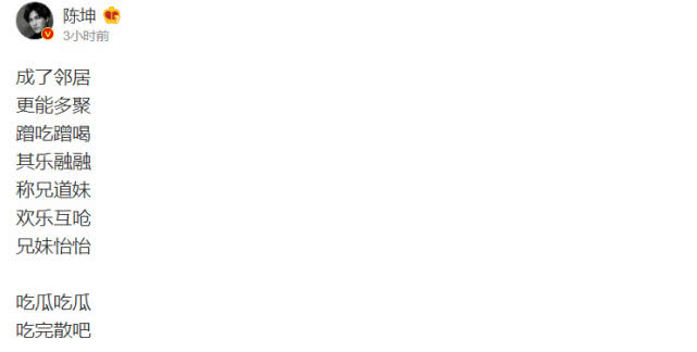 对于这样的事情,陈坤也是不含糊,整个消息刚传出不久,陈坤第一时间,就在自己的个人社交账号上发文,澄清了事情真相,原来之所以陈坤和倪妮一同前往住所,是因为陈坤和倪妮两个人,成为了邻居,作为邻居,平时聚会吃吃喝喝,也算是比较正常的事情,陈坤一直把倪妮当作妹妹看待,所以吃完这个瓜,大家都散了吧。