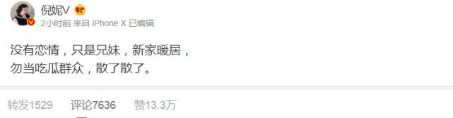 几乎与陈坤同时,倪妮在自己的微博上,也是随后发文,说明了这件事情的来龙去脉,原来倪妮和陈坤之间只是兄妹,没有恋情,这和陈坤的说法一致,因为倪妮乔迁新居,所以陈坤是去暖房的。