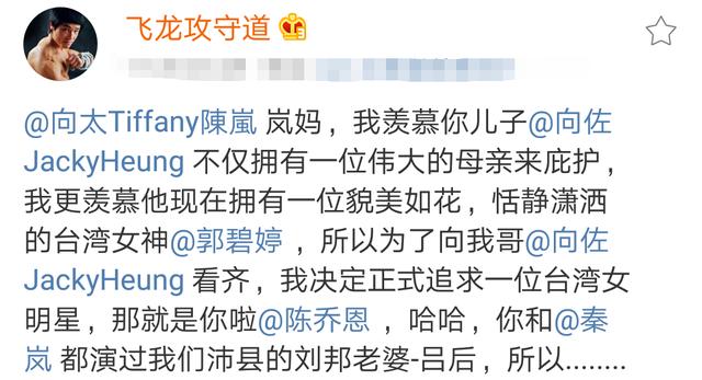 随即,飞龙又对台湾女星陈乔恩隔空示爱:“向太陈岚岚妈,我羡慕你儿子向佐不仅拥有一位伟大的母亲来庇护,我现在更羡慕他拥有一位貌美如花,恬静潇洒的台湾女神郭碧婷 ,所以为了向我哥向佐看齐,我决定正式追求一位台湾女明星,那就是你了,哈哈,陈乔恩 ,你和秦岚都演过我们沛县的刘邦老婆-吕后,所以……”
